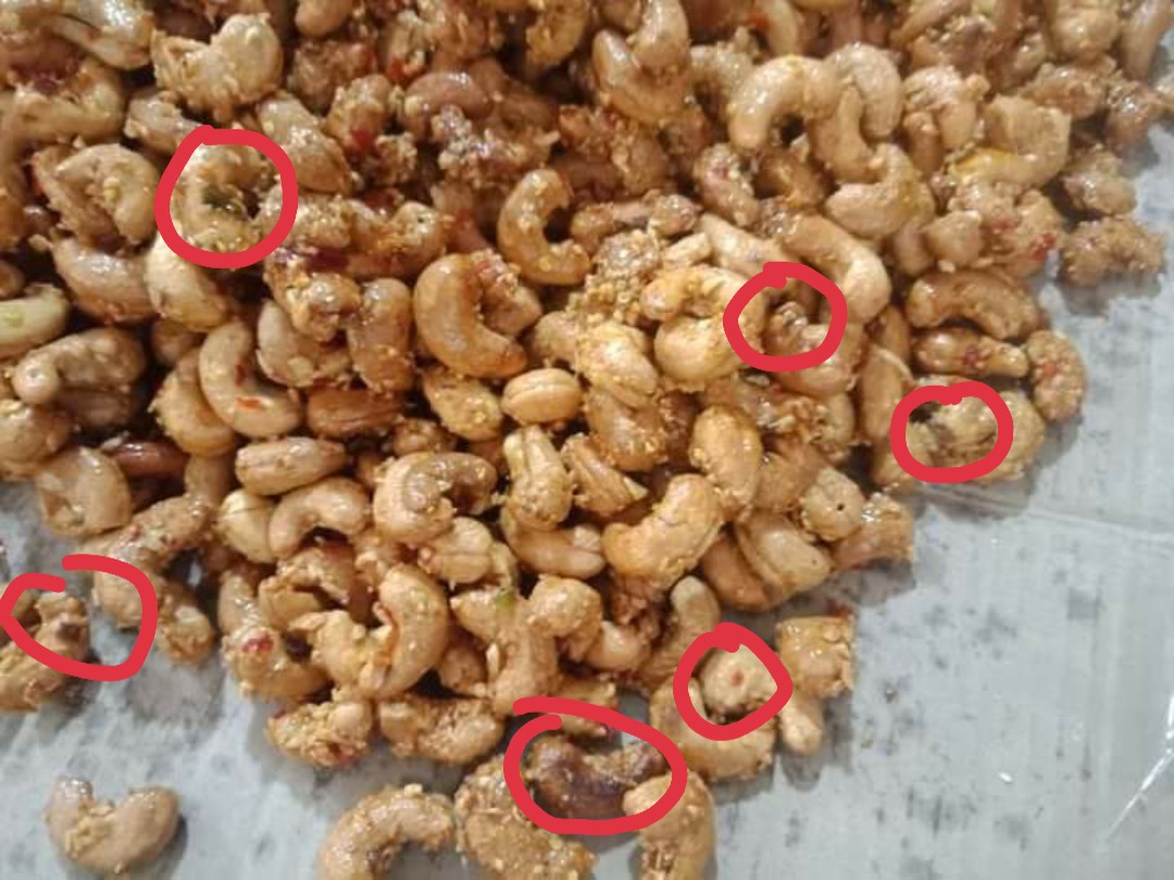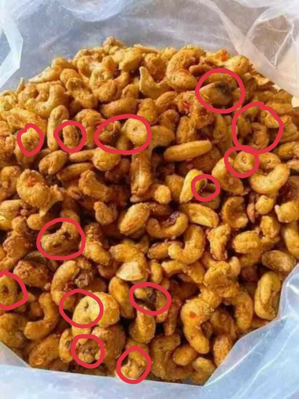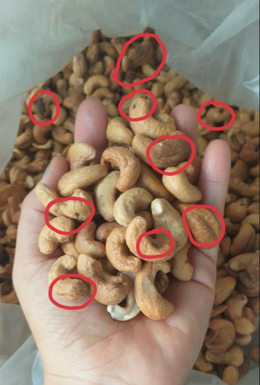 Những khoanh đỏ là hàng sâu. Và đây là những hạt điều bị vàng sẵn chớ không phải là hàng rang muối bóc vỏ lụa sẵn như nhiều người bán đã quảng cáo trước đó.